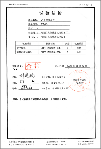 計(jì)量器具樣機(jī)試驗(yàn)結(jié)果通知書“IC卡智能熱水水表