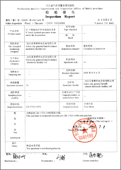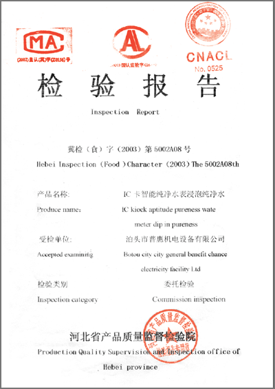 | 檢驗(yàn)報(bào)告 “IC卡智能純凈水水表浸泡純凈水”