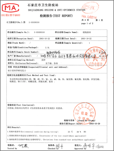 檢驗(yàn)報(bào)告 “石家莊衛(wèi)生防疫站浸泡后水”