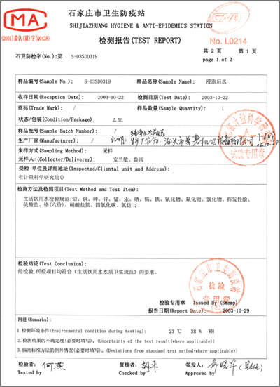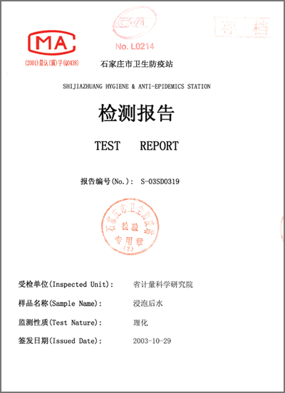 | 檢驗報告 “石家莊衛(wèi)生防疫站浸泡后水” |