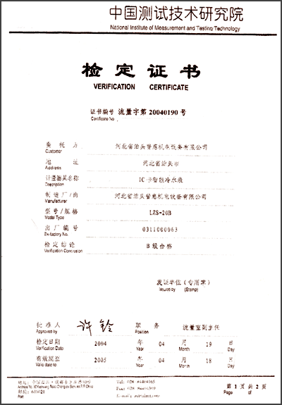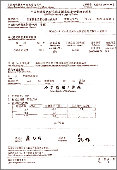 中國測試機術研究院檢定證書“IC卡智能冷水表20040190號”