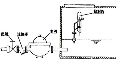 KYF型浮球式液壓水位控制閥安裝使用維護(hù)說明1.液壓水位控制閥公稱壓力分1.0Mpa、1.6Mpa兩等級。 2.主閥與導(dǎo)閥可組合安裝與分離安裝。100X以分離安裝為宜,當(dāng)主閥與導(dǎo)閥分離安裝時,所配管用戶自選。 3.為防止主閥內(nèi)堵,閥前應(yīng)加裝過濾器。 4.為安裝與維修方便。在主閥或控制導(dǎo)閥頂部應(yīng)留足夠大的入孔。 5.吊球式液壓水位控制閥,液面高度可調(diào),調(diào)整時改變球上方卡箍位置即可達(dá)到目的。 6.吊球式液壓水位控制閥,聯(lián)桿端部固定螺絲緊固要牢靠,防止松動,以免動作失靈,并定期檢查。 7.重錘位置可調(diào),球升卡箍位置,球應(yīng)隨波面同時上升,不然,調(diào)整重錘位置加大力臂長度即可。 8.主閥不過水時,檢查小導(dǎo)閥是否堵塞,當(dāng)達(dá)到設(shè)定液面繼續(xù)供水時,檢查導(dǎo)閥內(nèi)是否有臟物卡在閥瓣與閥芯之間。 9.液壓水位閥前是否設(shè)止回閥?液壓水位閥下游要安裝手動閘閥或碟閥,起到硬關(guān)閉的作用;如果液壓水位閥為了壓力或其它考慮進(jìn)水口安到水位以下的,要考慮安裝止回閥,防止水回流。 KYF型浮球式液壓水位控制閥安裝示意圖A. KYF型主閥體與控制導(dǎo)閥結(jié)合式安裝  |